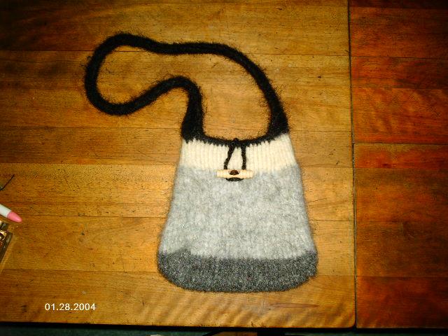 Cette bourse est tricotée au tricotin et ensuite je l'ai mise dans la laveuse pour la faire feutrer. J'ai utilisé du mouton shetland que j'ai filé très lâchement pour aider au feutrage. |