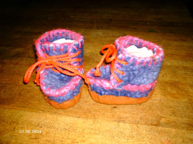 Ces petites bottes sont en laine de mouton shetland. J'ai utilisé du mohair pour la couture et une pièce de cuir pour le dessous des bottes; c'est pour un bébé de 0 à 6 mois à peu près. J'ai confectionné un feutre à plat et ensuite j'ai taillé 4 petites pièces pour chaque bottes. |