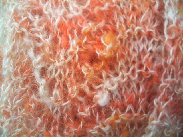 petite dentelle toute simple dont j'ai fait une écharpe en mohair et restes de wensleydale teint et superficiellement cardés et retordu au moahir |