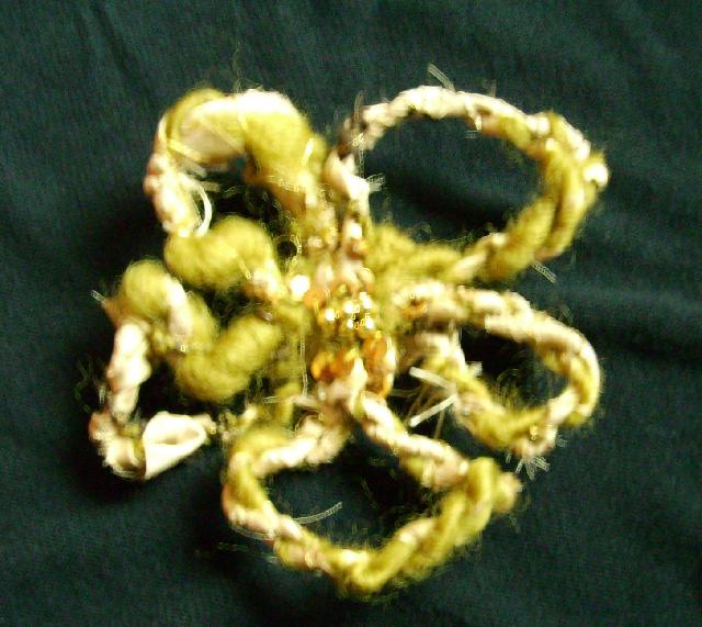 encore un petit chale, mais qui m'a fait enrager avec son point "muguet", j'ai détesté! mais fini, je l'aime bien! il pèse 100 grs tout rond et je l'ai fait avec un reste de cone mélange de laine et angora. |