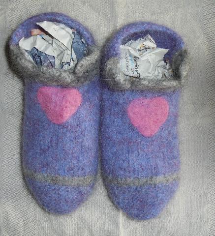 voic mes derniers chaussons toujours sur le meme modèle avec une petite variante un couer fait avec les aiguilles à feutrer |
