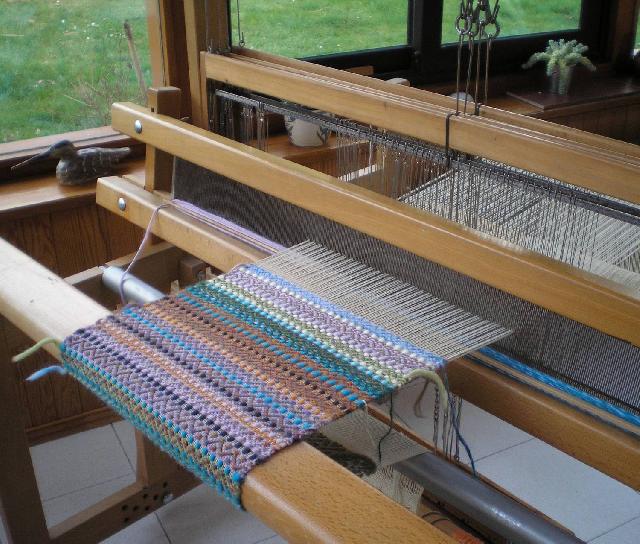 Sur mon Harp à peigne envergeur. Peigne le plus fin. Elle fait 17 cm de large. Offerte à mon ami Damien, et j'ai oublié de noter le nb de fils, du coup vous n'en saurez rien, na. |