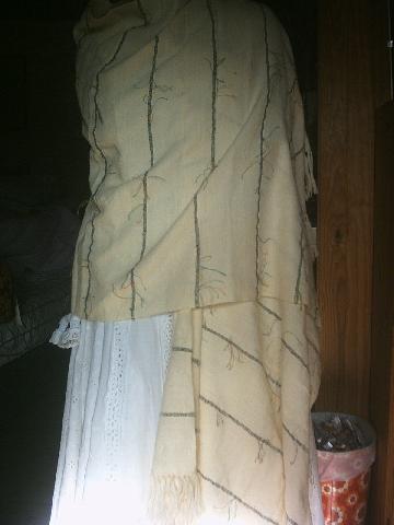 Tissage. 12 fils au cm. fini 68 cm de large, 2m15 de long. Tous les 10 cm 3 'rangs' de fil noir fantaisie. Bcp d'erreurs à cause d'un mauvais enroulage sur l'ensouple arrière (que je vais modifier dès la fin de cette chaine) et quelques erreurs lors de l'enfilage. |