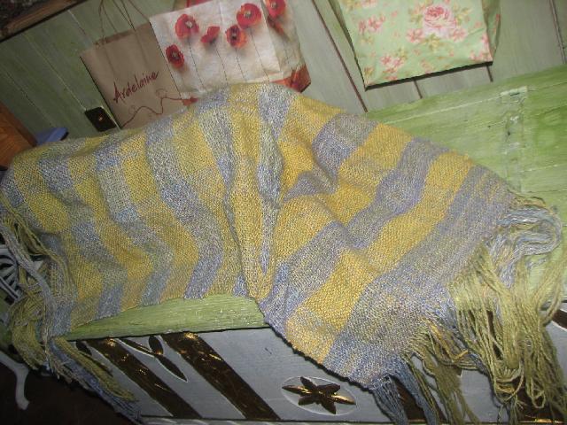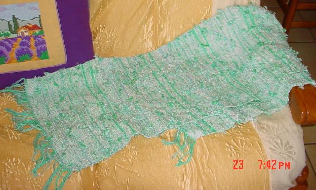 enfin aprés plusieurs tentatives sur l'écharpe hiver on voit bien la chaine (grosse laine 7) et la trame (3,5) ,les deux sont tissées avec un Tissanova modèle A |