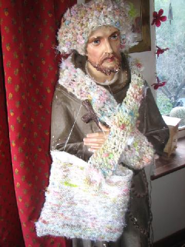 Saint François d'Assises coiffé du béret, emmitouflé dans l'écharpe et portant le sac tissé |