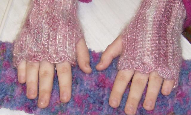 voici les mitaines tricotées au crochet par ma nièce Audrey avec le mohair filé main par ses soins durant les vacances d'été. |