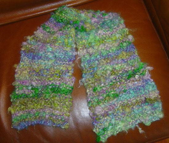 Voici une écharpe tricotée avec l'écheveau de Laurence gagné à la loterie de la dernière rencontre de fileurs |