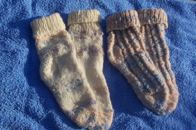 Les écheveaux de Céline ont donné deux paires de chaussettes, une avec des torsades, une assortie à de la laine de pays |