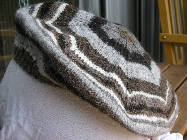Voici le béret que j'ai réalisé avec les quatre couleurs naturelles de shetland (15 g. de chaque) filée il y a quelque temps. |