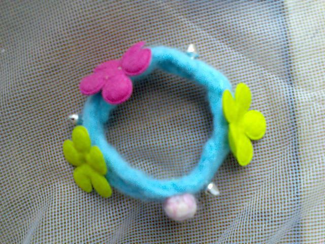 voici mon premier bracelet en feutre, accessoirisé de petits grelots et de fleurs |