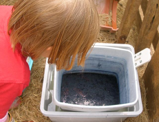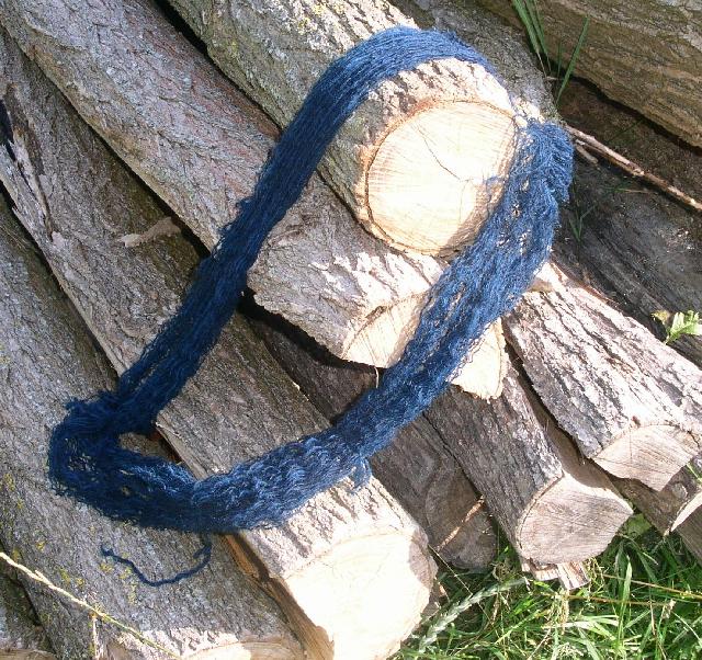 un echeveau de laine teint en bleu par cecile