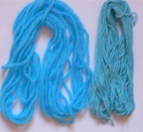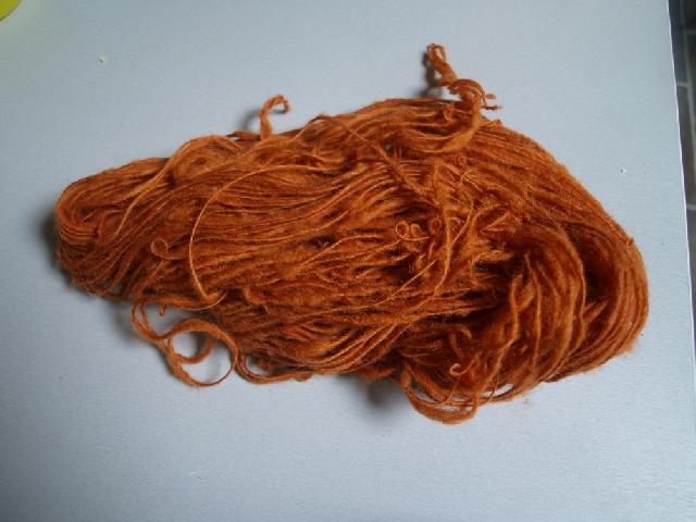 Sur fibre Rouge de l'Ouest, base teintures pour oeuf bios Auro à la chlorophile, qui ont pâli au soleil. Par dessus du vert Wilton's et vinaigre, puis un peu de bleu Wilton's avec un peu de noir One. Résultat : du violet! |