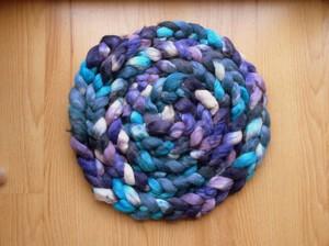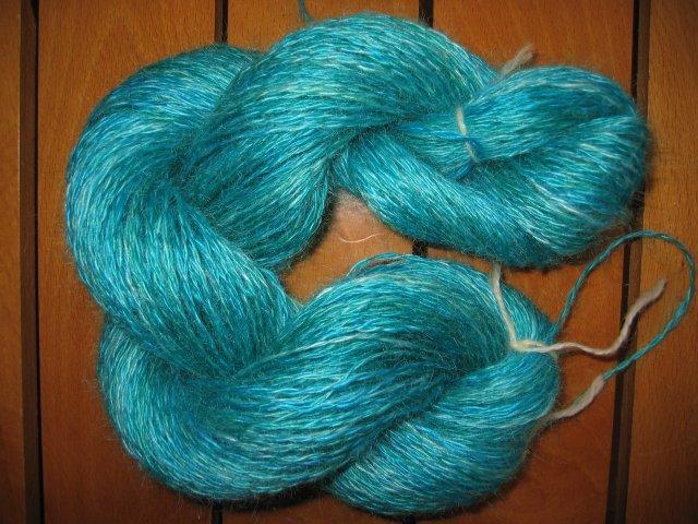 Une mèche (de chez Florence) teinte avant filage avec des colorants alimentaires, du bleu et du vert. |