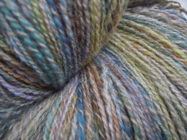 échevau de mérinos 16microns teint à l'étuvée avec un mélange de teintures dupont, pébéo et teintures alimentaires du mouchon. divisé en fines mèches, filé "fin" et retordu avec du BFL greige (100grs 450m +/-) |