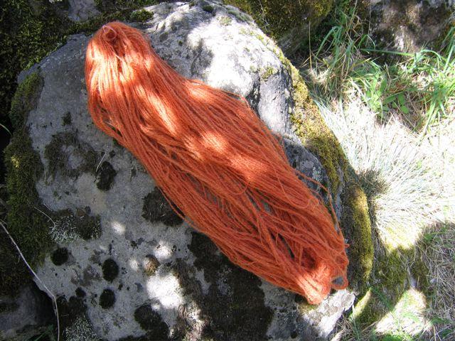 Laine filé et teinte avec de la garance . Pour arriver à ce que je voulais ( rouille orangé ) il m'a fallu 4 bains mais la garance avait 30 ans et ne devait plus avoir beaucoup de pouvoir de teinture |