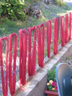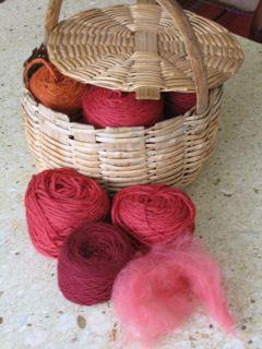 3 bains de cochenille (le 1er et le 2eme sur deux laines du commerce et de la toison de merinos) .A gauche dans le panier une des pelotes teinte avec la garance |
