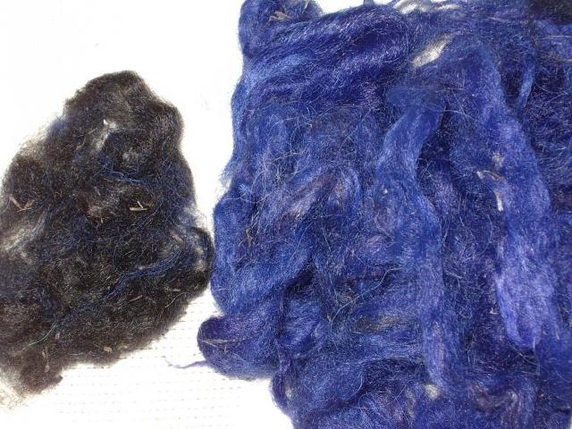 Pour terminer une veste je n'avais plus assez d'alpaga de jeanne marie, et j'ai teint une petite partie blanche d'un autre alpaga dont la majorité était chocolat (voir image en 2006), il restait des fibres chocolat, et elles sont devenues noires |