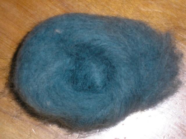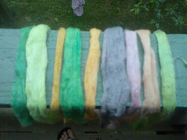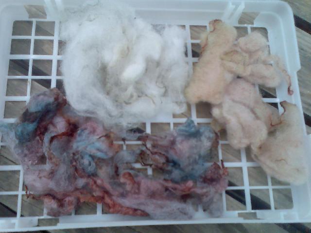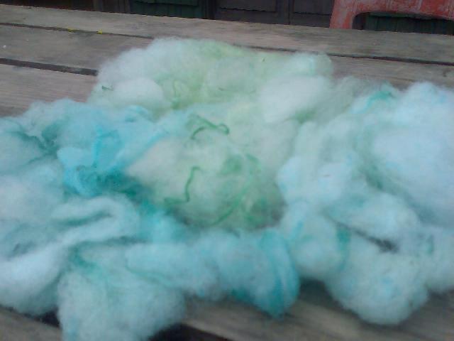 j'ai lavé la toison, puis j'ai cardé à la main et enfin, j'ai passé en cardeuse à rouleaux pour avoir une nappe, j'ai mouillé ces nappes, et mouillées, je les ai étirées pour avoir des mèches que j'ai finalement teintées à l'étuvées avec mes teintures liquides... pas mal non? |