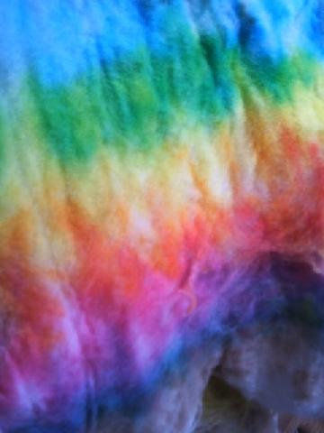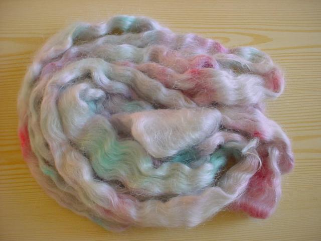 Mohair du Mouchon, teint avec des colorants pour oeufs de Pâques, effet marbré. Les couleurs sont en gel, il faut les faire fondre avant de les appliquer sur la laine. J'ai appliqué sur laine très humide, les couleurs (rose et bleu) se sont mélangées entr'elles. La prochaine fois je ferai sur laine bien essorée. |