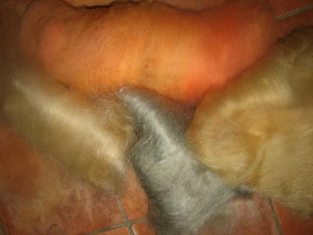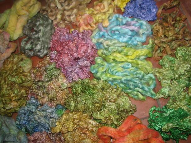 voici mes nouvelles teintures, il y a en fibres brutes, wensdayle et du gotland de Florence puis mérinos, soie, agneau et mohair peigné, un peu de lin aussi. |