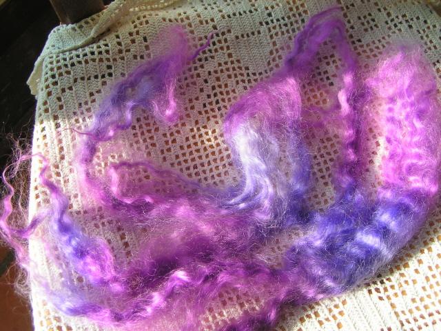 Avec mes restes de bleu et de violet j'ai teint une mèche de mohair. On a beau dire pour la teinture le mohair c'est magique ! |