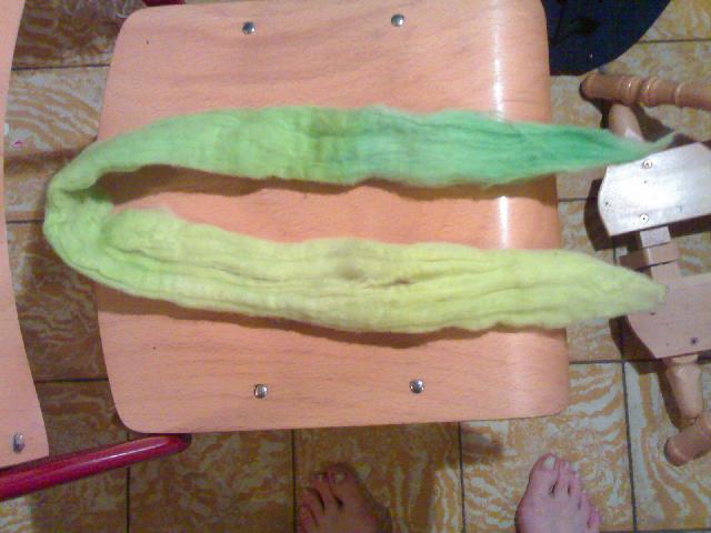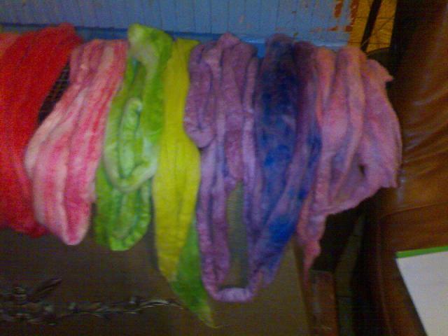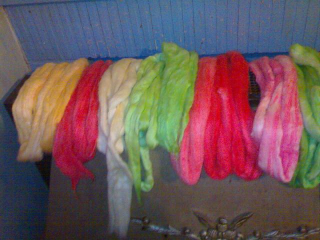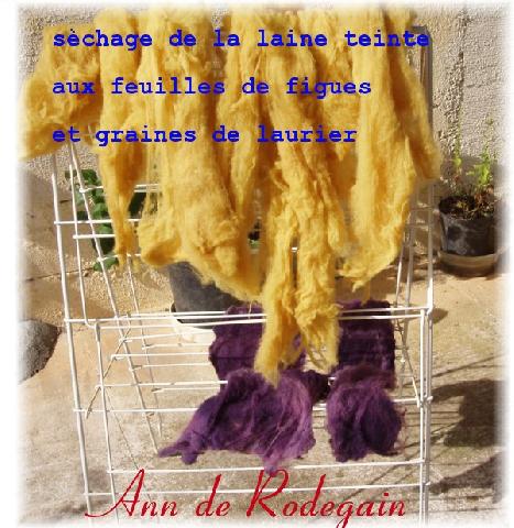 sèchage de mes teintures aux feuilles de figues + sumac (je pensais obtenir un vert tendre ... et j'ai eu un jaune d'or !...) et laurier |