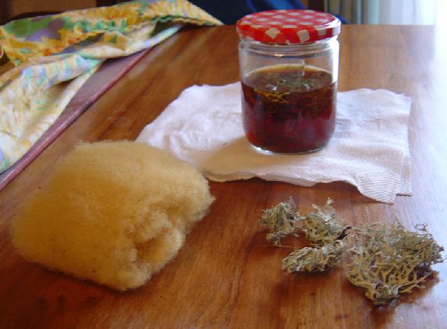 lichen rammassés sur un arbre ,essai de teinture en faisant bouillir le lichen et essai de macération à l'ammoniaque |