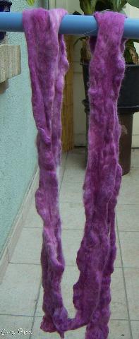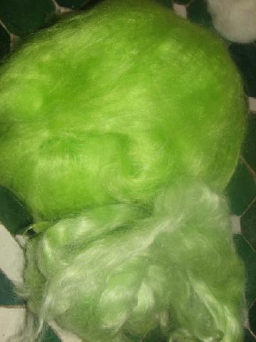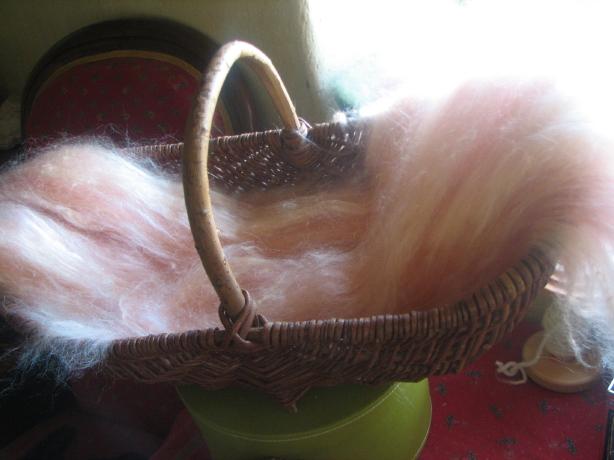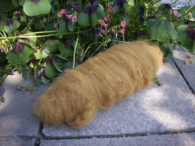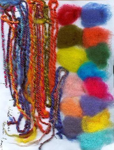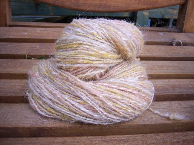 Un peu de tout : du texel de Florence teint avec des couleurs roses peinture pour soie; de la laine inconnue (et mauvaise) teinte avec les fleurs de trèfles (un beau jaune vif au final), le tout cardé ensemble. |