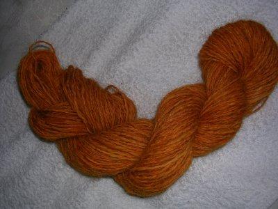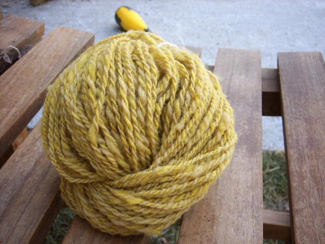 un fil de laine ( la mauvaise inconnue) teintée oignons, retordu avec un fil de laine teinté à tout : trèfle, merise, carotte sauvage, racine de pissenlit (faut amuser les enfants ! ... et moi ;...) |