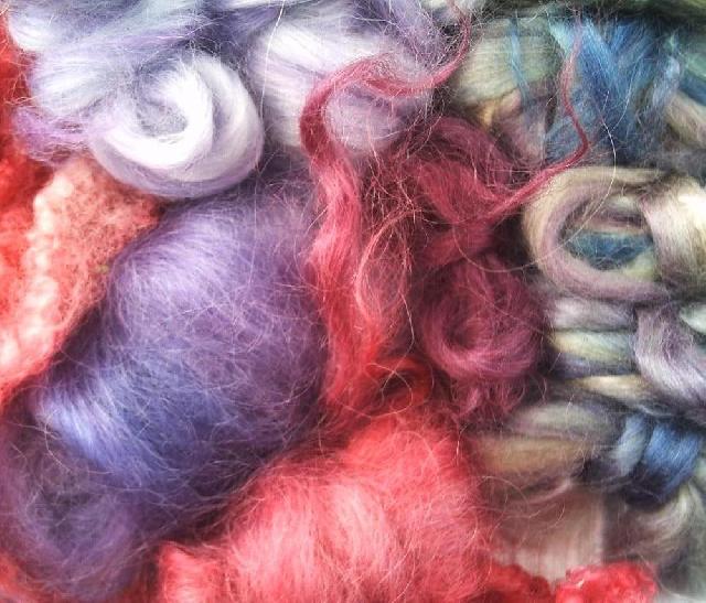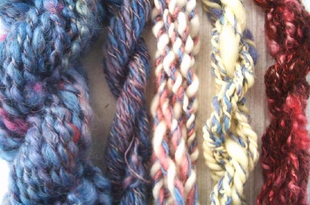 de haut en bas en tournant dans le sens des aiguilles d'une montre: Soie Maulbere, soie tussah, teeswater et mohair |