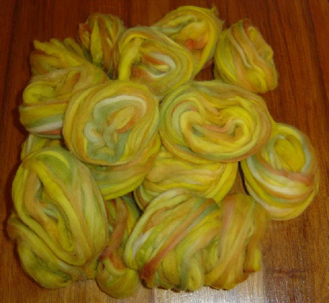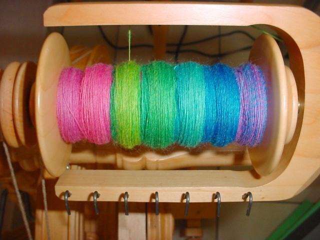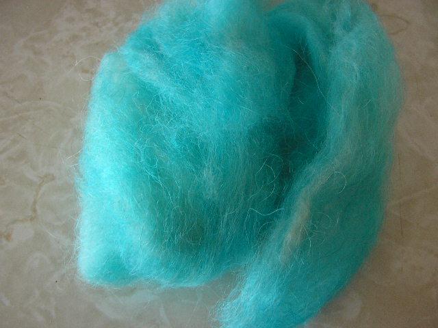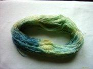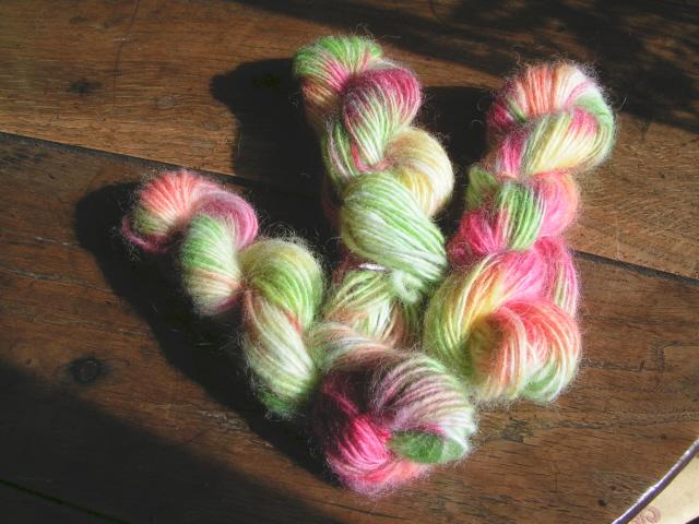 Résultat : 3 écheveaux de 25g de mohair (ou apparenté) filés au fuseau et teints au micro-ondes à la teinture alimentaire |