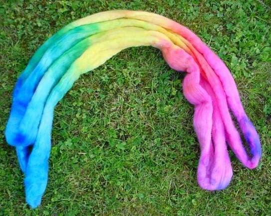 Un deuxième essai d'arc-en-ciel, je voulais des couleurs pastels, alors j'ai dilé la teinture pour soie (1 volume de teinture pour 10 d'eau au moins), c'est moins soutenu que le premier arc-en-ciel, mais pas du tout pastel ! |