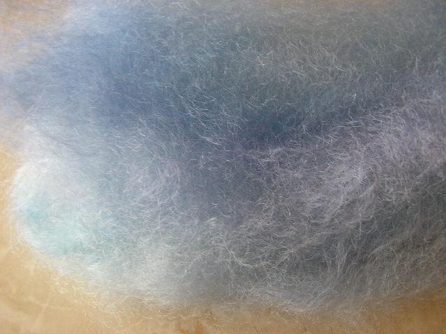 Inspiré par une photo de Luisa. J'ai voulu reproduire ces couleurs bleues. Mohair et fil brillant, retordu en bouclé. |