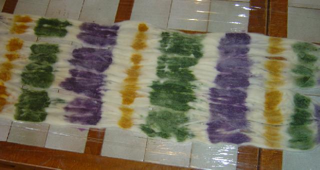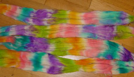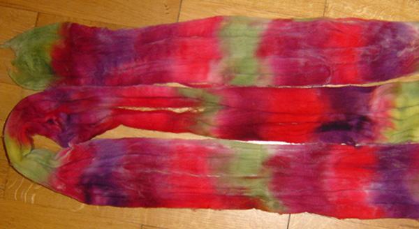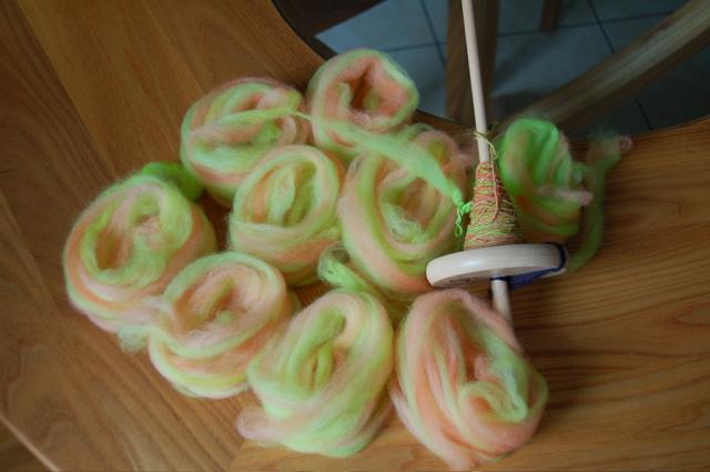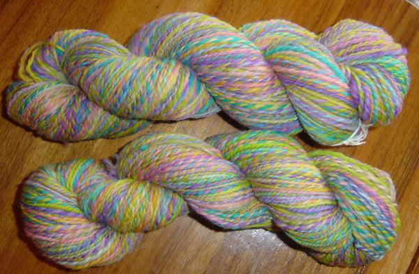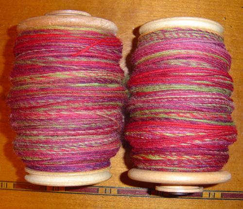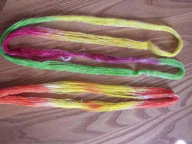 Le dernier fil sorti du rouet , toujours mérinos : émeraude , jaune,et prune. |