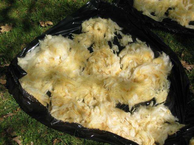 Et après lavage, la couleur est encore plus belle. Je suis un peu perplexe : que vais-je arriver à faire avec cette laine pleine de petits débris ? En plus comme j'ai lavé à l'eau froide elle n'est pas franchement déssuintée. Par contre le suint est propre ! |