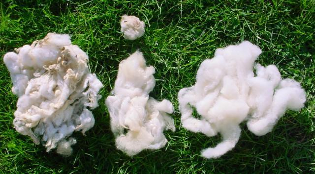 Rambouillet AOC, à gauche la toison lavée, à droite la toison après "flick carding". |
