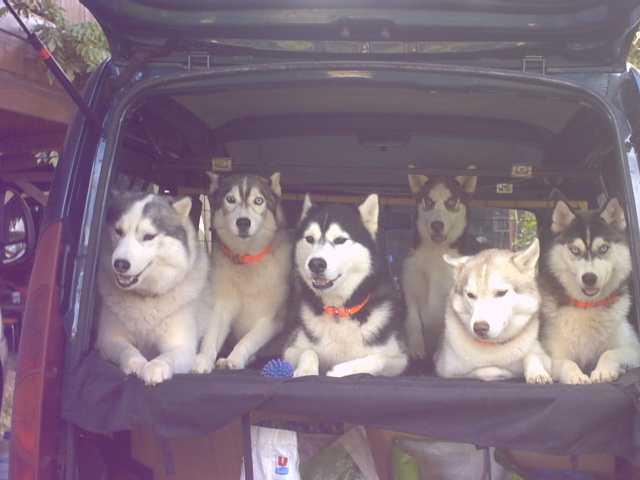 Voilà une photo de mes 6 huskies qui m'approvisionnent en poils. |