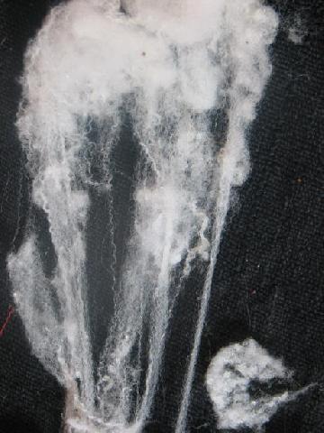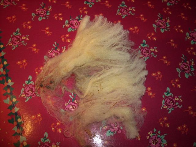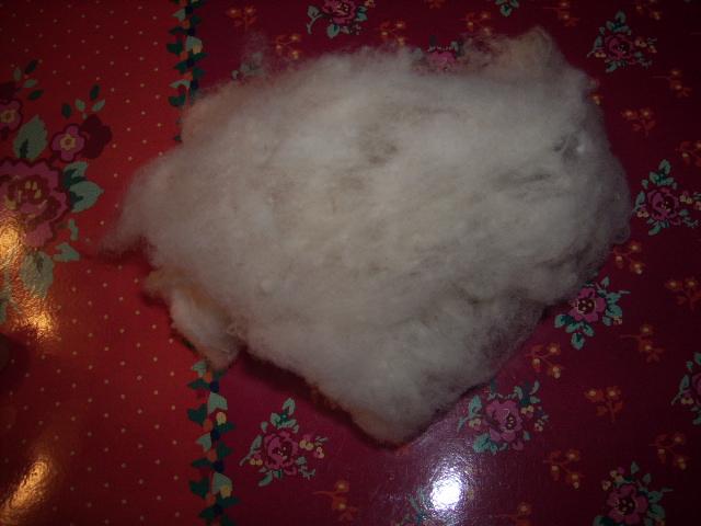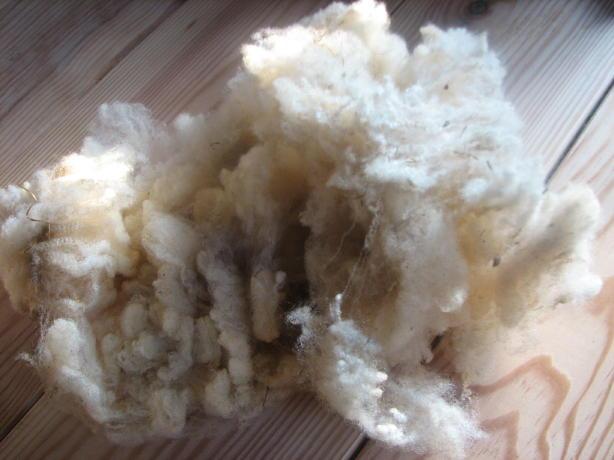 toison brute. Aucune adhérence dans la saleté car peu de suint. C'est une fibre qui gonfle énormément au fur et à mesure qu'elle sèche, c'est incroyable ! On peut observer ce phénomène en quelques secondes car elle est tellement gonflée d'air qu'elle sèche trés vite et donc triple de volume |