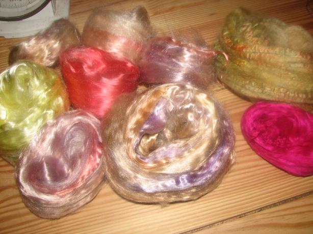 Pour votre information, voici le tencel que j'ai teinté et sur la droite deux rubans teintés de soie (tussah et maulbère). Vous voyez bien la différence de brillance. J'adore cette fibre de bois. J'ai hâte de faire tous mes essais de filage avec. |