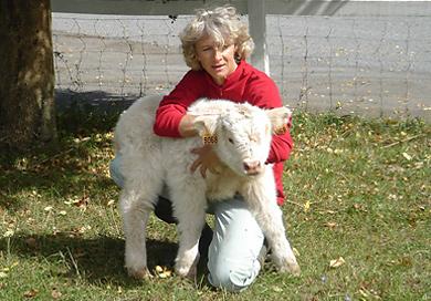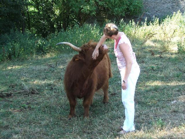 Un bébé Highland Cattle blanc avec Isabelle Leydier Delavallade |