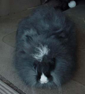 Aujourd'hui est un grand jour pour ce jeune lapin angora qui va avoir sa première dépilation. Il a tout juste 2 mois et s'appelle Titou. |