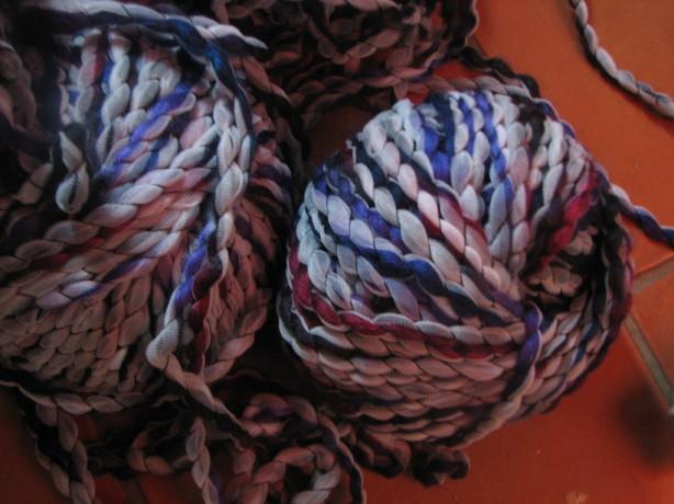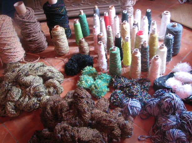 voici mon dernier achat au grenier à laine. La photo globale ne peut pas donner la précision du détail de chaque fil.... une performance en matière de fil fantaisie. Avec les gros cônes du fond, on peut réaliser de gros rideaux à mouches ou des tapis de sol... les idées ne manquent pas ! |