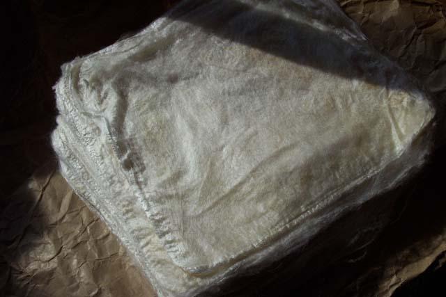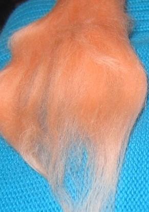 voilà une portion de fibre, vous voyez comme elle est courte et infilable en un seul fil, je n'ai pas essayé mais je pense que c'est impossible de la filer seule, j'ai préféré l'intégrer à de la fibre cardée |
