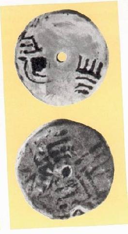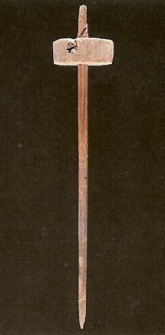 Fuseau découvert dans un village d'artisans du Nouvel Empire (XIXè-XXè dynastie) 13è-12è siècles av.n.è. (Deir el-Médineh -Thèbes) H : 34,5 cm ; Diam (fusaïole) : 50cm ;ép : 2 cm. |