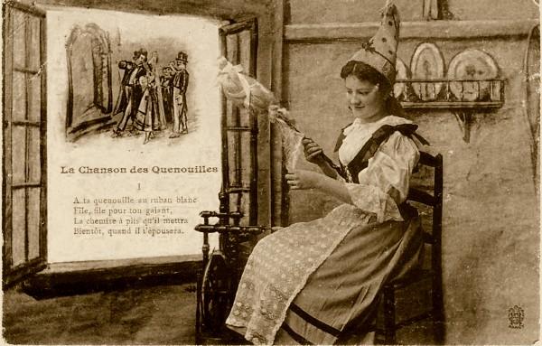 carte ancienne (1907) avec le texte du premier couplet de la chanson des quenouilles : |