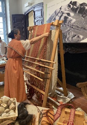Reconstitution d'un métier vertical à pesons tel que dans l'antiquité romaine et démonstration. (atelier de Sagillia) |