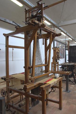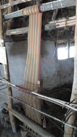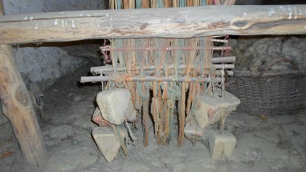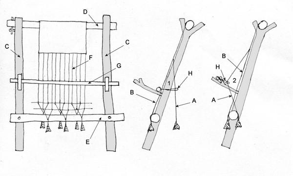 Les pesons sont ici attachés à une barre sur laquelle vient se nouer des groupes de fils de chaîne. On n'a donc pas besoin d'avoir beaucoup de pesons et ils peuvent être plus lourds que des pesons qu'on attache directement aux groupes de fils de chaîne. |